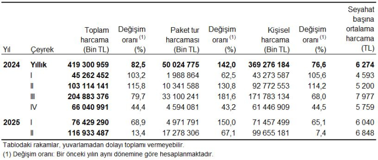 Seyahat başına ortalama harcama 6 bin 848 TL olarak hesaplandı.