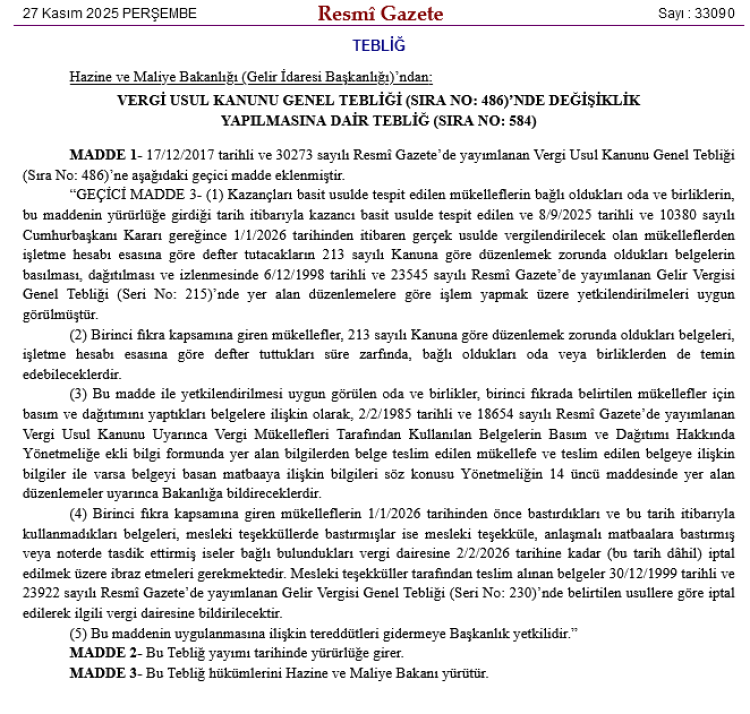 Tebliğ ile mevcut düzenlemeye Süreksiz Unsur 3 eklendi. Buna nazaran, yararları kolay yolda tespit edilen ve 8 Eylül 2025 tarihli Cumhurbaşkanı Kararı uyarınca 1 Ocak 2026’dan itibaren gerçek yöntemde vergilendirilecek mükellefler için evrak basım, dağıtım ve izleme süreçlerinde yeni bir geçiş sistemi getirildi. Düzenlemeyle, bu kapsamdaki mükelleflerin bağlı oldukları oda ve birlikler, Vergi Usul Kanunu kapsamında tutulması gereken defter ve kullanılacak dokümanların basımı ve dağıtımı konusunda Gelir Vergisi Genel Bildirisi kararlarına nazaran yetkilendirildi.