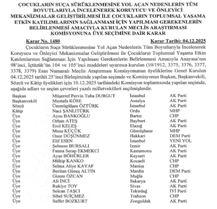 Türkiye Büyük Millet Meclisi’nin aldığı kararla oluşturulan komite, çocuk suçluluğuna neden olan toplumsal, ekonomik ve ruhsal etkenleri araştırarak tahlil teklifleri geliştirecek. Resmi Gazete’de yayımlanan karar ile komitenin vazife alacak milletvekili üyeleri resmen belirlenmiş oldu.