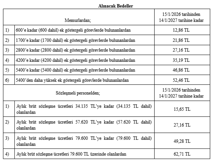 Memurlar için günlük asgari yemek bedelleri, ek göstergeye göre 12,86 TL ile 52,46 TL arasında değişirken; sözleşmeli personel için günlük yemek bedeli, brüt sözleşme ücretine göre 15,65 TL’den başlayıp 62,71 TL’ye kadar yükseliyor.