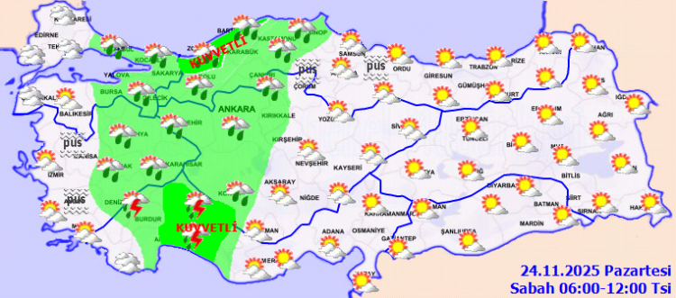Marmara’nın doğusu, İç Ege, Batı Akdeniz, İç Anadolu’nun büyük kısmı, Batı Karadeniz ile Samsun, Amasya, Çorum etrafları ve Mersin’in batı ilçelerinde sağanak ve yer yer gök gürültülü sağanak yağış bekleniyor.
