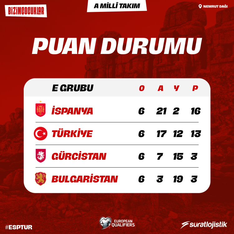 2026 FIFA Dünya Kupası Avrupa Elemeleri E Kümesi’nde son maçların akabinde oluşan puan durumu şöyle oldu: