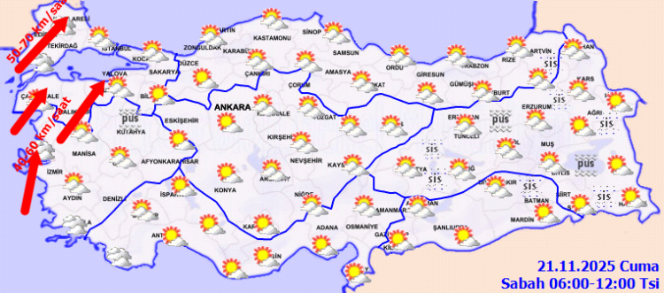 Rüzgarın; Marmara’nın batısı ile Kuzey Ege kıyılarında güney ve güneybatı istikametlerden kuvvetli (40-60 km/saat), Trakya’da yer yer kısa vadeli fırtına (50-70 km/ saat) formunda esmesi bekleniyor. Sabah ve gece saatlerinde Doğu Anadolu ile Güneydoğu Anadolu’nun kuzeyinde pus ve yer yer sis bekleniyor.
