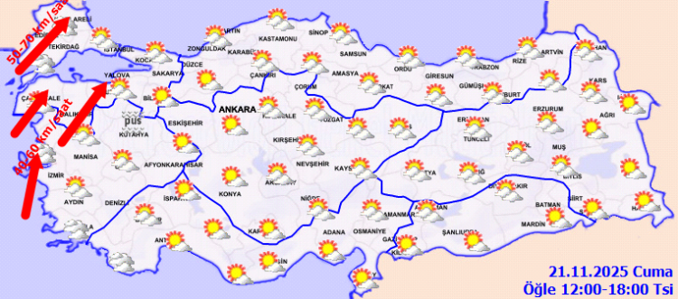 Rüzgar çoklukla güneyli, Güneydoğu Anadolu’da Kuzey taraflardan hafif, orta sıra orta kuvvette, Marmara’nın batısı ile Kuzey Ege kıyılarında kuvvetli (40-60 km/saat), Trakya’da yer yer kısa müddetli fırtına (50-70 km/ saat) biçiminde esmesi bekleniyor.