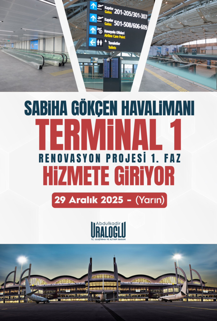 İSTANBUL (İGFA) – Sabiha Gökçen Havalimanı’nda Terminal 1 Renovasyon Projesi’nin ilk fazı yarın hizmete girecek. Ulaştırma ve Altyapı Bakanı Abdulkadir Uraloğlu, artan yolcu talebine yanıt olarak yürütülen projeyle havalimanının kapasitesinin artırılacağını ve yolcu konforunun güçlendirileceğini belirtti. Proje kapsamında Terminal 2, Terminal 1’e yaklaşık 240 metre uzunluğunda bir bağlantı köprüsüyle entegre edildi. Otopark kapasitesi artırılırken, metro çıkışına entegre şehirler arası otobüs transfer alanı sayesinde terminal geçişleri hızlandı ve daha konforlu hâle getirildi.