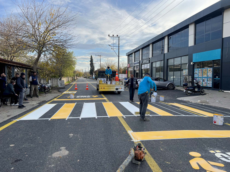 Asfalt çalışmaları sonrası yol çizgileri ve yaya geçitleri imalatları tamamlanan ilçedeki toplam 20 kilometrelik ulaşım çizgisi ilmek ilmek işlendi.